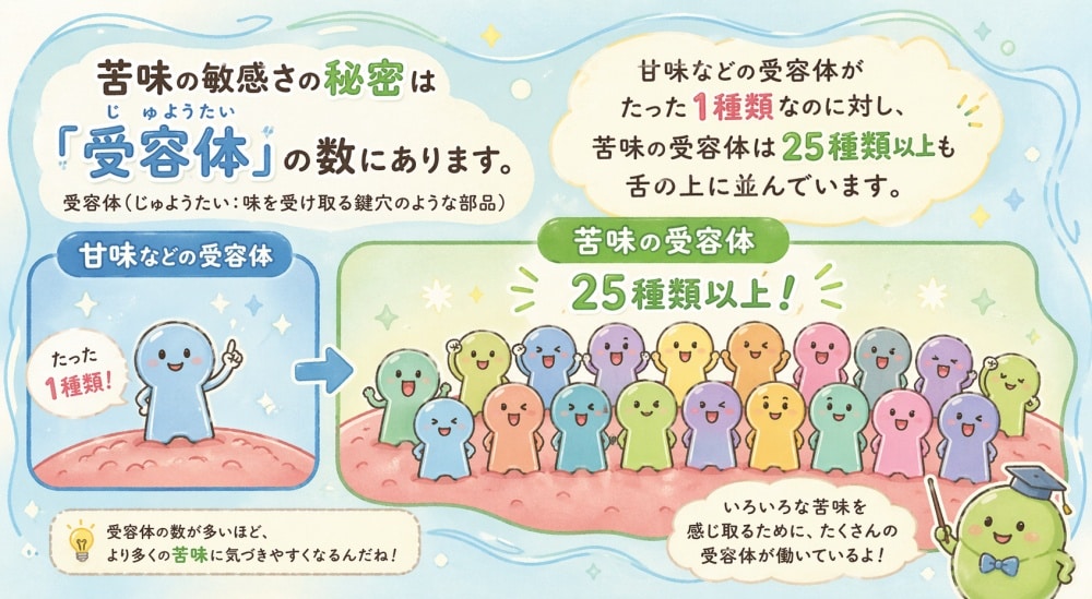 苦味の敏感さの秘密は「受容体(じゅようたい:味を受け取る鍵穴のような部品)」の数にあります。