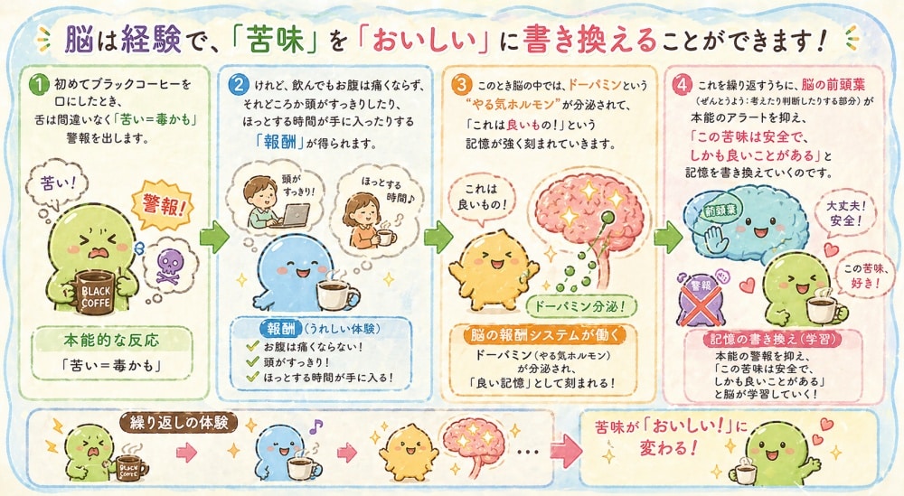 これを繰り返すうちに、脳の前頭葉(ぜんとうよう:考えたり判断したりする部分)が本能のアラートを抑え、「この苦味は安全で、しかも良いことがある」と記憶を書き換えていくのです。
