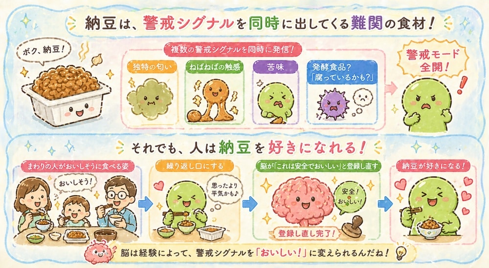 それでも娘が納豆を好きになれたのは、家族がおいしそうに食べる姿を見ながら繰り返し口にするうちに、脳が「これは安全でおいしい」と登録し直したからなのです。