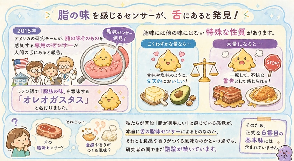 さらに、私たちが普段「脂が美味しい」と感じている感覚が、本当に舌の脂味センサーによるものなのか、それとも食感や香りがつくる風味なのかという点でも、研究者の間でまだ議論が続いているため、正式な6番目の基本味には含まれていません。