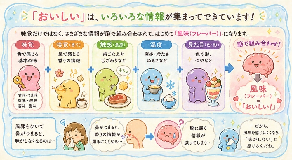 風邪をひいて鼻がつまると味がしなくなるのも、風味の多くが嗅覚で決まっているからなのです。