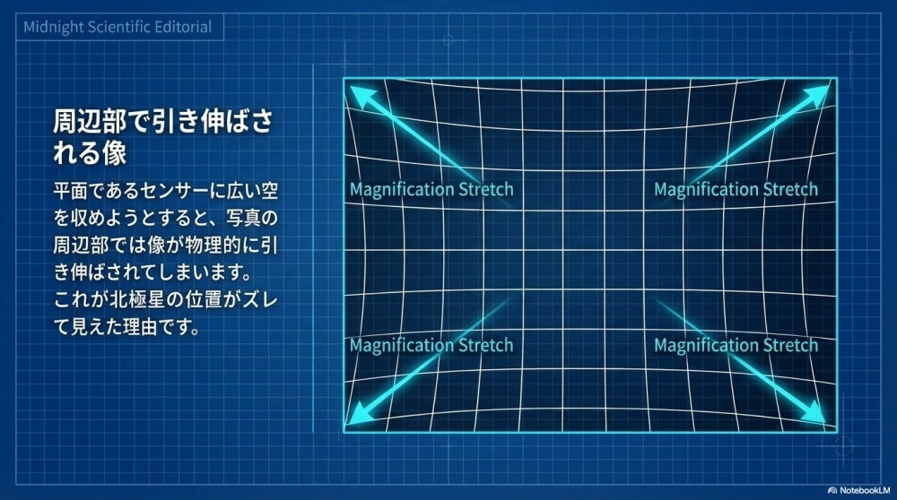 実際の夜空ではまっすぐ一直線上にある星が、写真のうえでは曲がって写ったり、距離の比率がくずれたりするので要注意です。