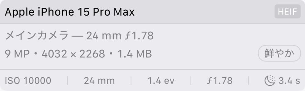 今回の写真の設定は、ISO 10000、絞りf1.78、シャッタースピード3.4秒でした。