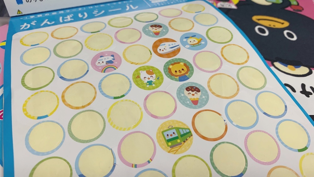 学研のドリルには、様々なキャラクターの「がんばりシール」が付属していて、初めてできたページに貼ります。