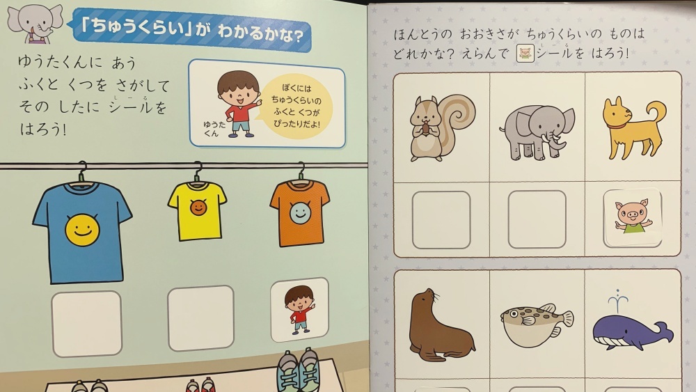 様々な例を挙げて、大きい・小さい・中くらいを説明して取り組めば、このページでも20〜30分かかります。
