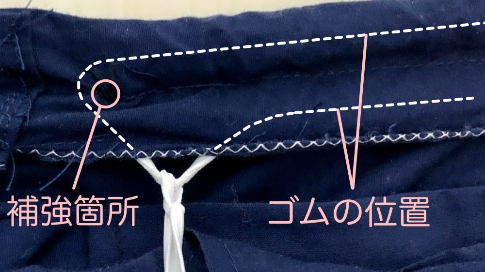 ゴムは二箇所、ウエストの内側で通します。