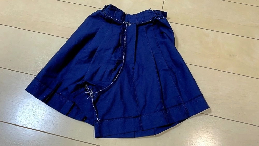 大人のサイズのショートパンツをまず作ってから、袴のプリーツを寄せていくことで、袴の形に仕上げていきます。