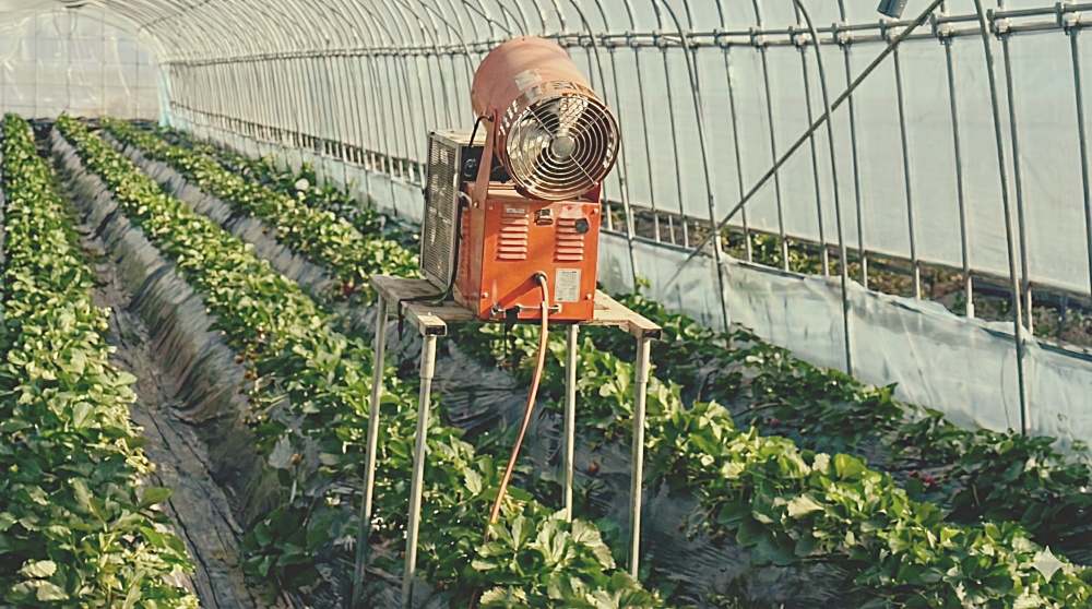 ビニールハウスの外に並んでいたLPガスボンベと、中で回っていたファン。