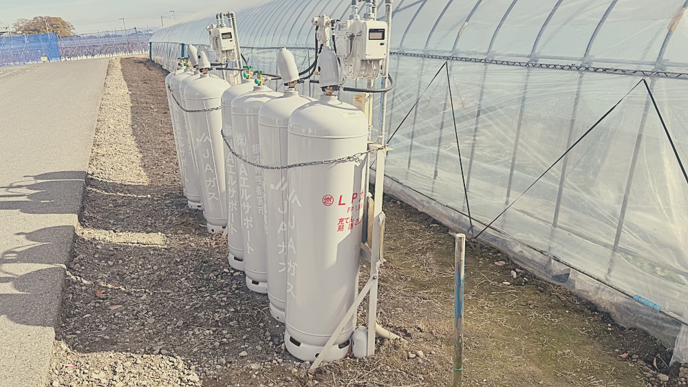 さらに興味深かったのは、ハウスの外にLPガスボンベが並べられていたことです。