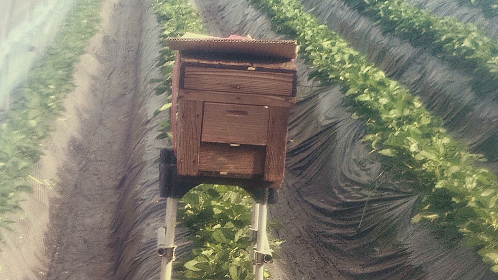 ハウスの中に置かれたミツバチの巣箱