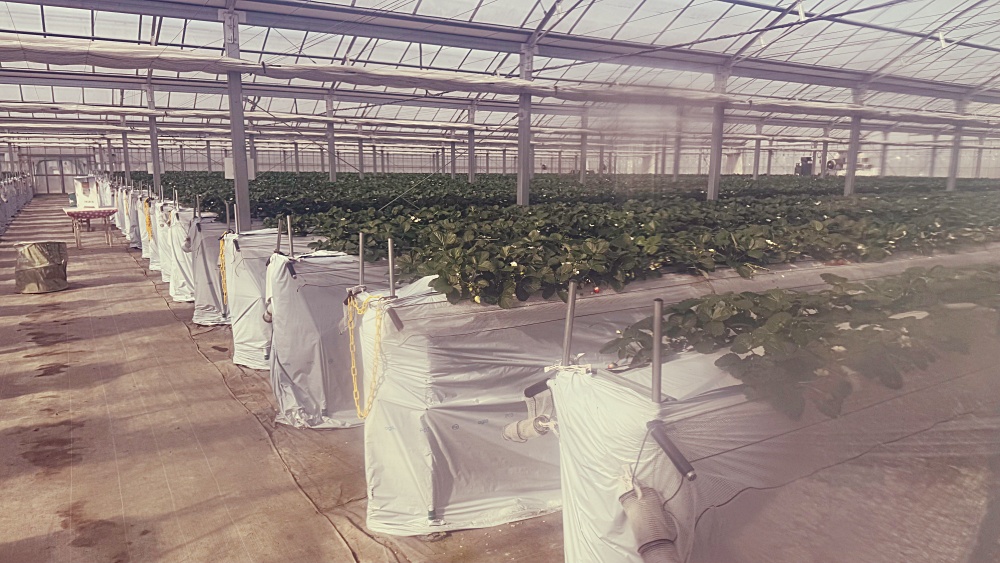 密閉ハウスに植えられた収穫を待ついちご
