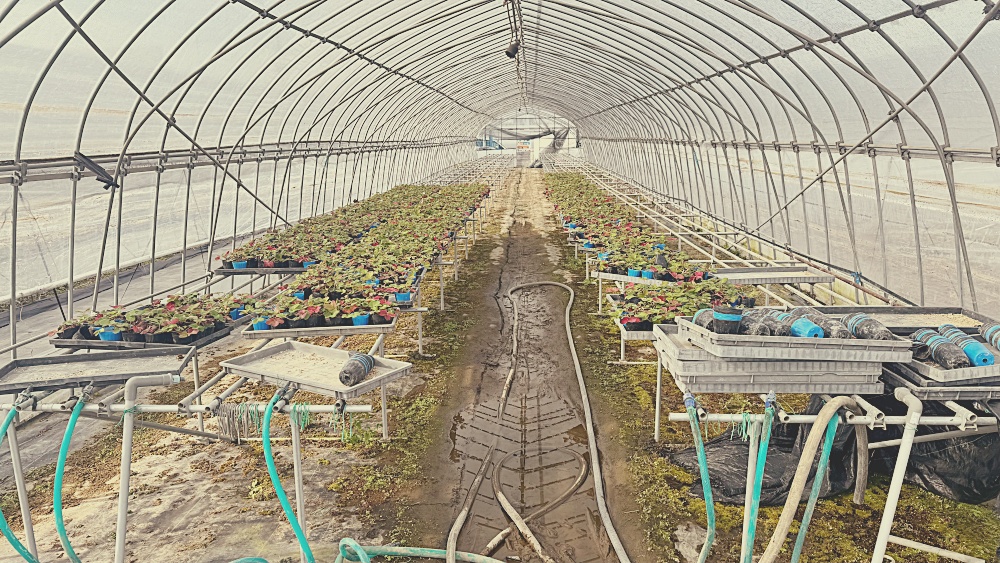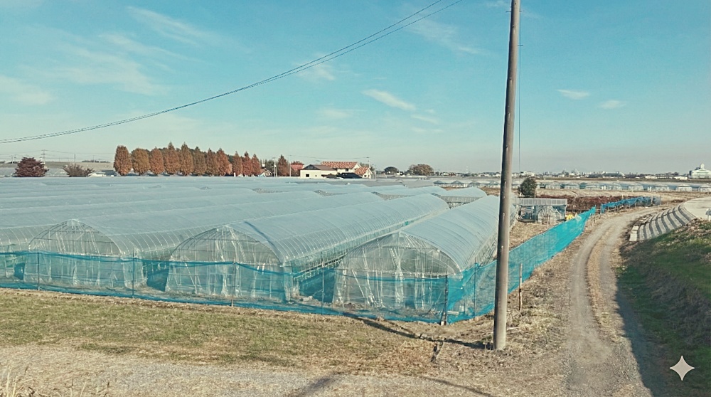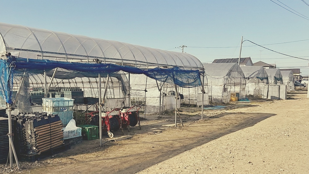 一帯に広がるいちごのビニルハウス(人や障害物をGeminiで削除)