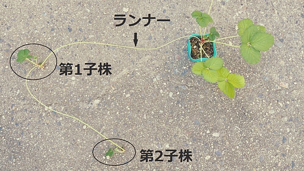 親株からランナーがのびて、その先に子株ができ、さらにそこから孫株、ひ孫株、という感じで増えていきます。