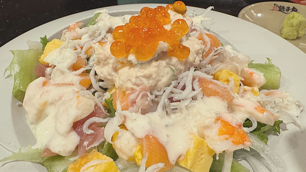 海鮮サラダには、マグロ、サーモン、エビ、しらす、いくらなど贅沢な具材がたっぷり。