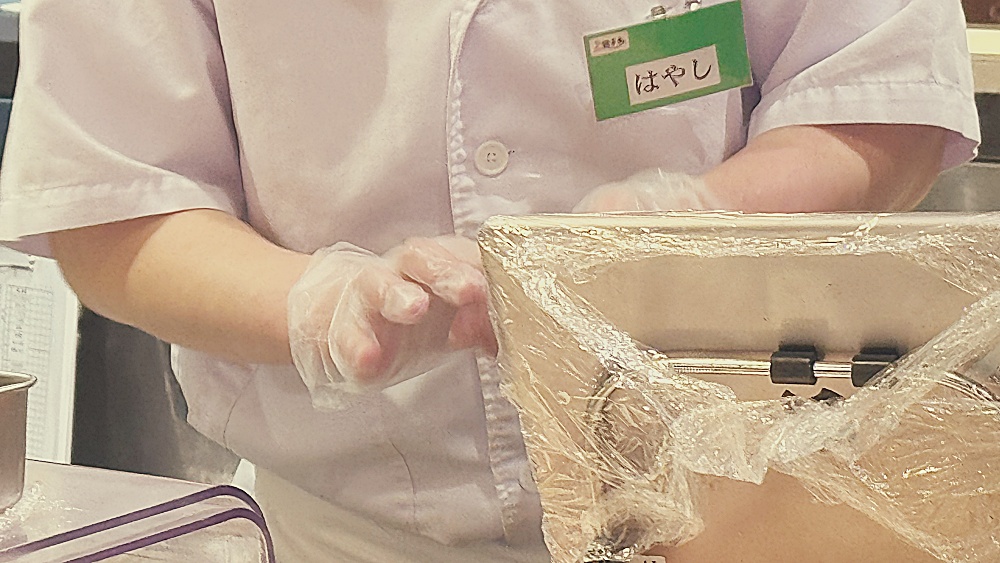 職人さんの手元をよく見ると、使い捨て手袋をして衛生管理を徹底しながらも、手早く美しくお寿司を仕上げていきます。