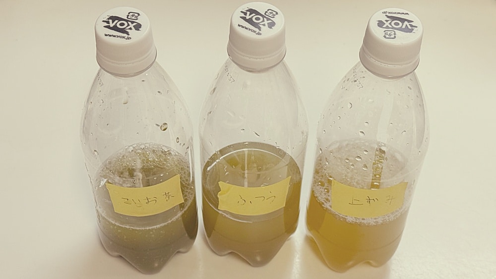 こうして、上澄み液と、底の沈殿物を含む液と、普通のお茶の、3つの異なる液体を200mlずつ準備。