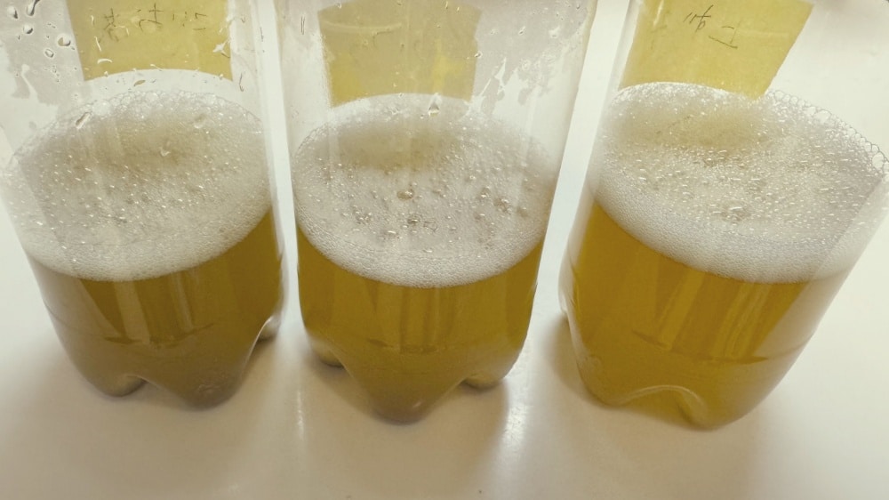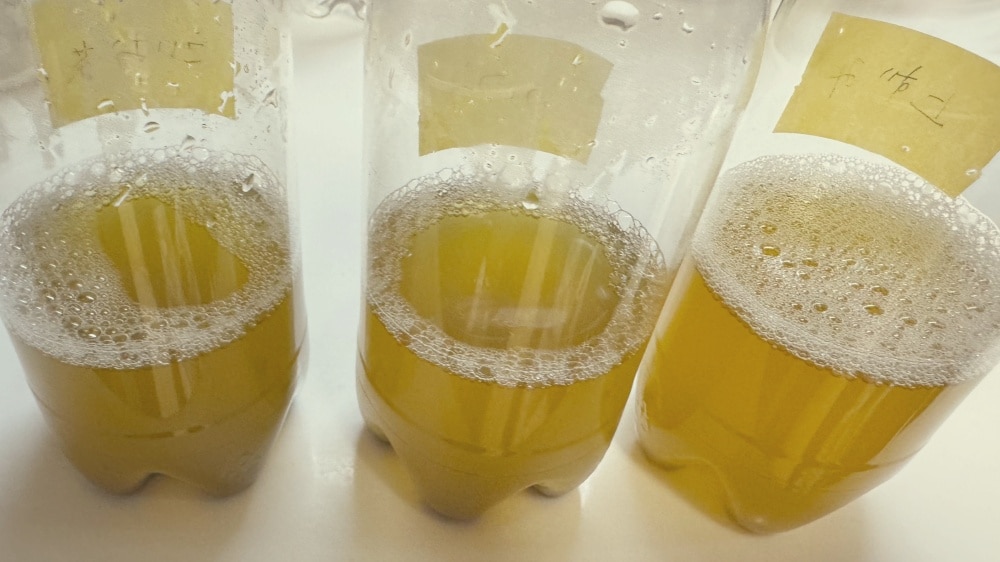今回は、上澄み液と沈殿した粉を含んだ液に分離したお茶、分離しなかったお茶の、それぞれの泡立ちを比べる実験の様子をまとめました。