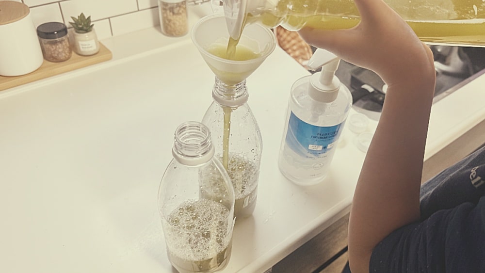 取り出した上澄み液のお茶は、ロートをつかって別のペットボトルに入れました。
