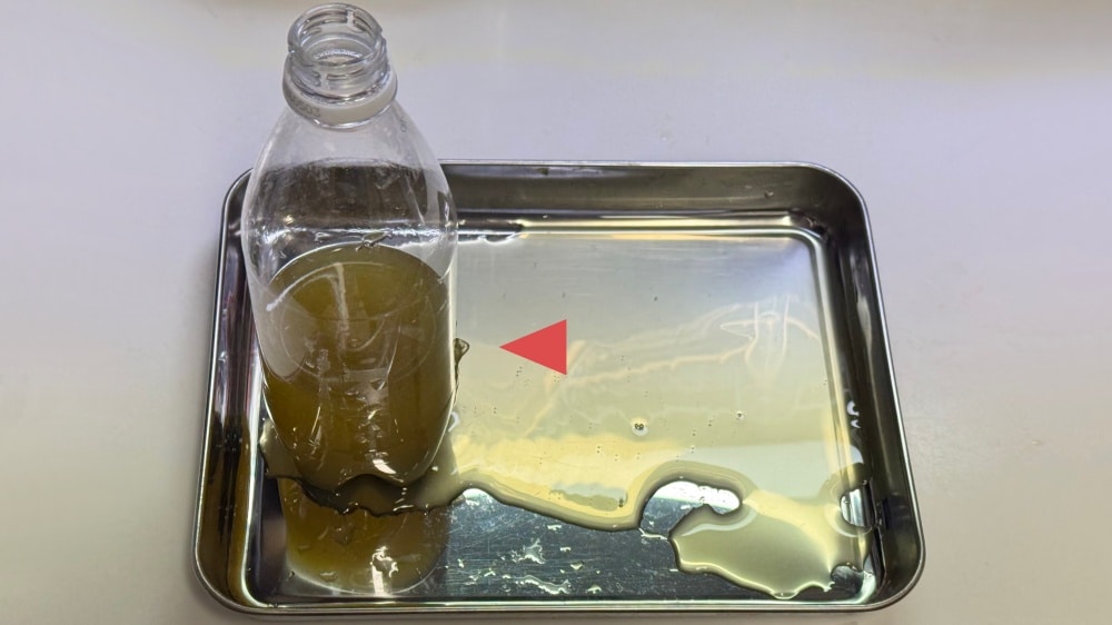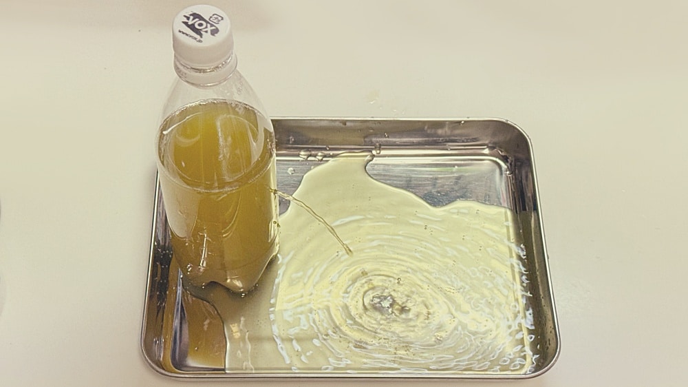 9時間後、まずはペットボトルの上の穴のセロハンテープをゆっくりはがして、トレーに液体を流しこんで取り出しました。