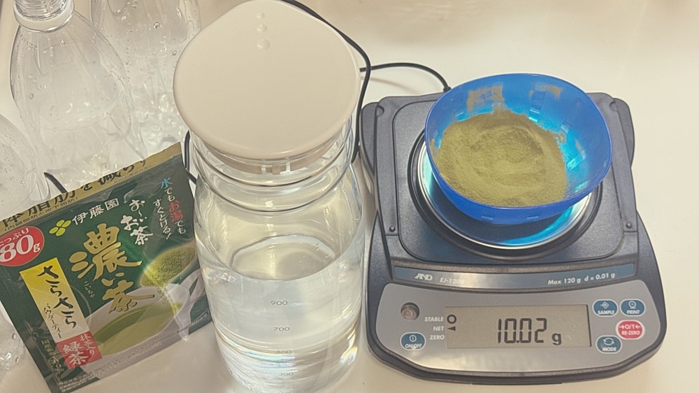 子供といっしょに安全に実験できるように、お湯はつかわず、水出しのお茶の粉を用意しました。