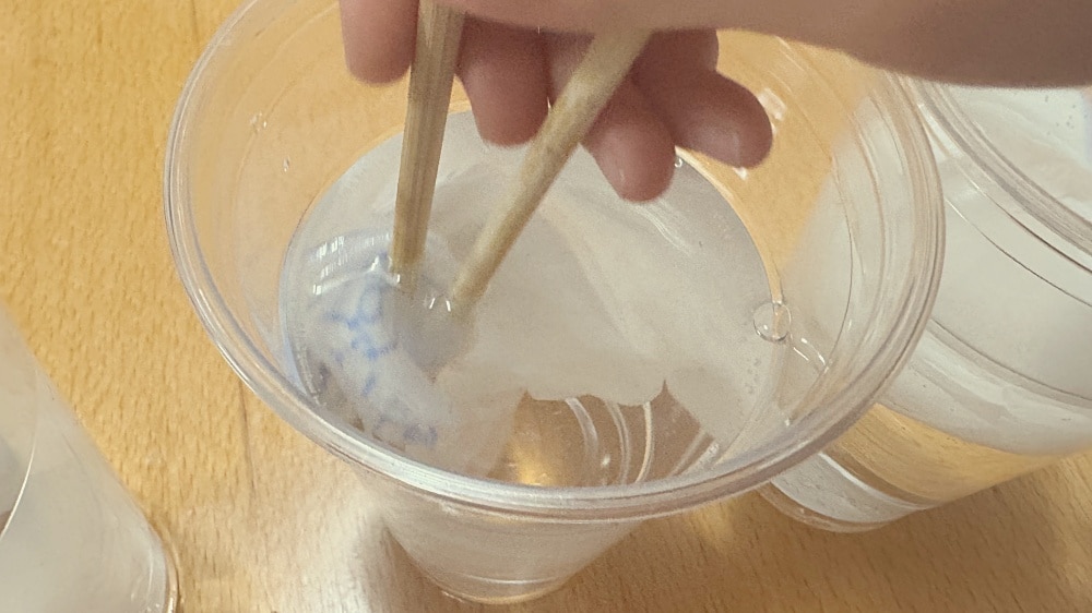 3つのカップにそれぞれの紙を入れ、割り箸でかき混ぜます。
