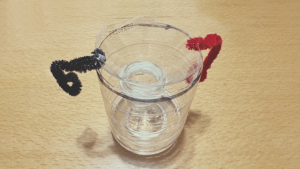 左右の穴にはモールでアームを取り付けて、カップの上のほうで固定できるように工夫しました。