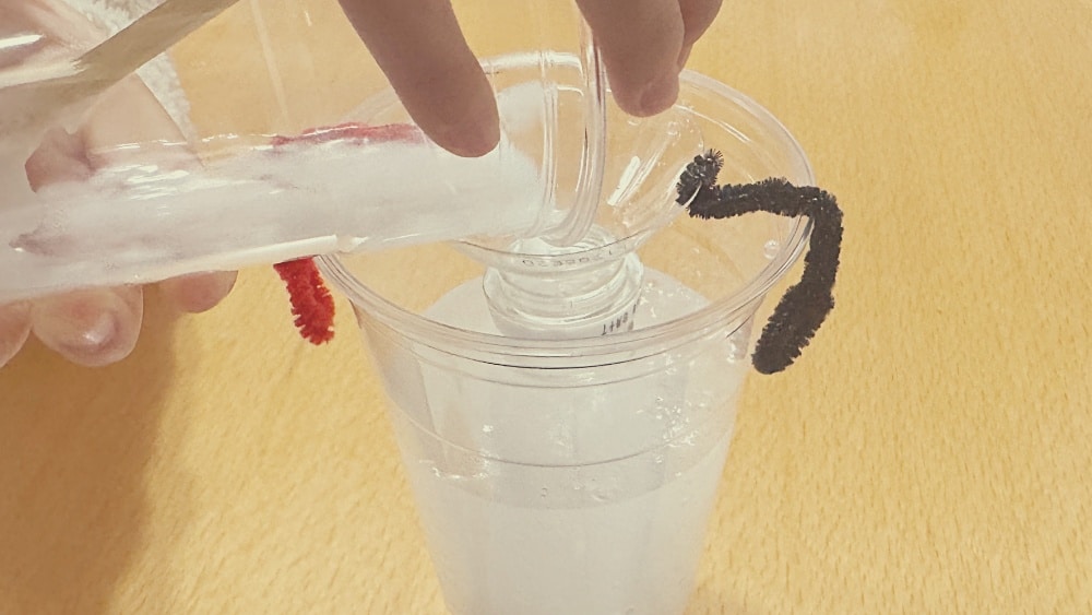透明の大きなプラスチックカップを3つ用意し、それぞれ7分目の高さまで水を入れました。