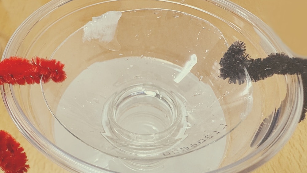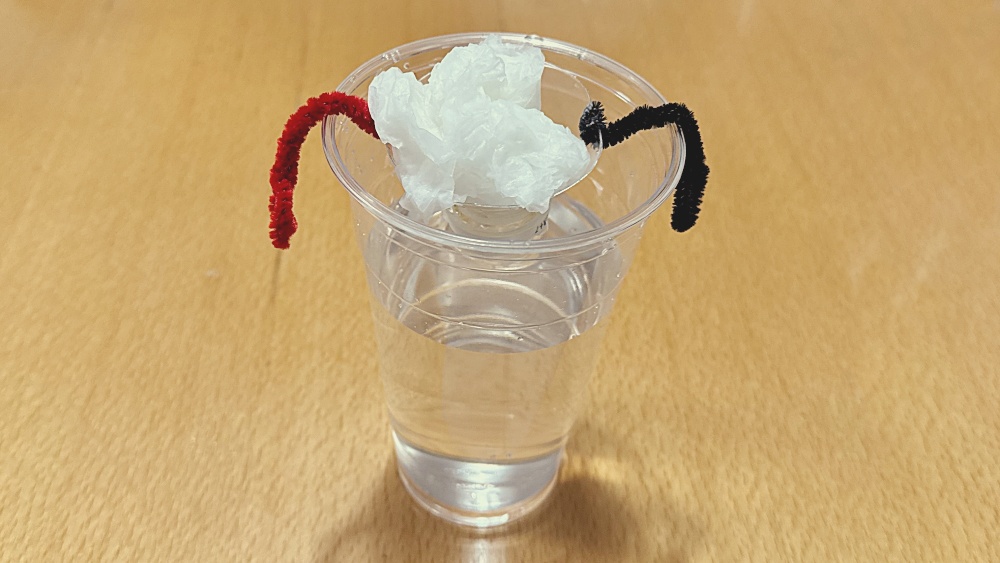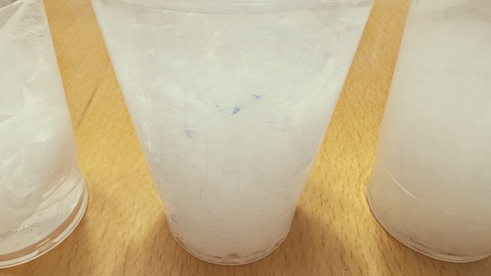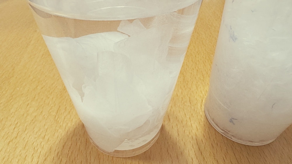 しかし、実験①では、紙の溶け具合をしっかり観察するために、大きな透明カップにたっぷりの水を入れています。