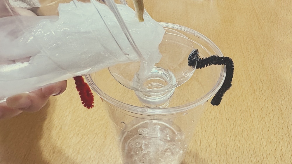 水と一緒に、細かく分解された紙がスーッとペットボトルの口を通り抜けて、下のカップに落ちていきました。