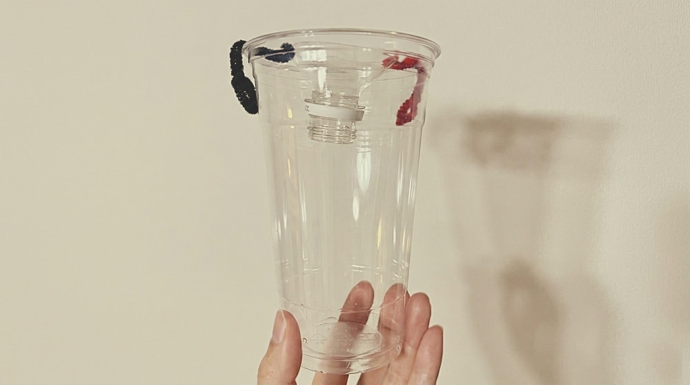 そこで考えたのが、実験①と同じサイズの大きな透明カップの上にセットするという方法。