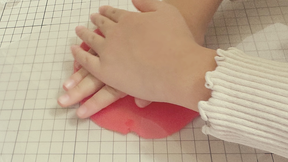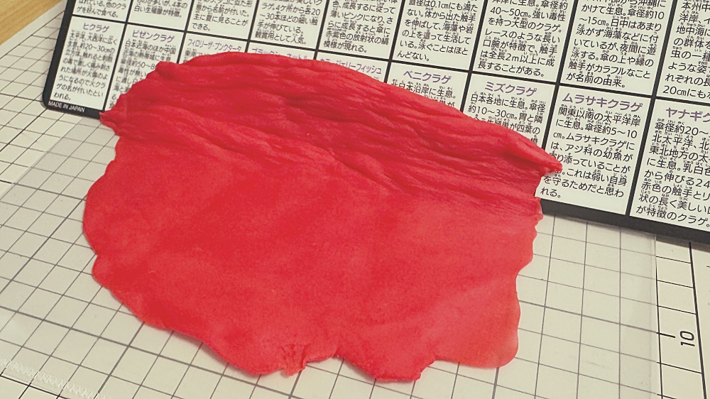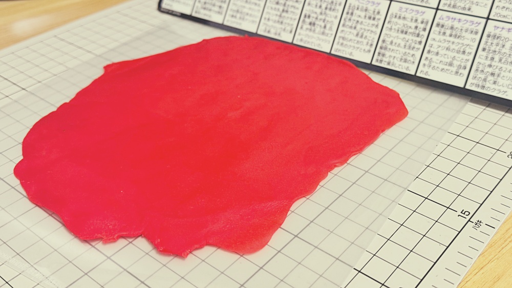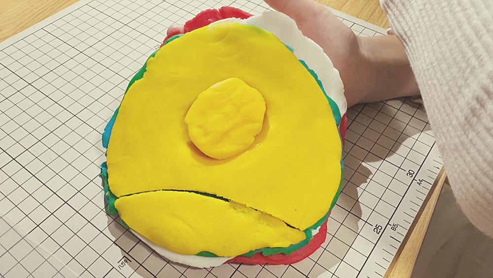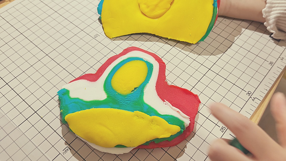 カッターマットの上に丸めた粘土の半分、その上にシート状にした黄、緑、白、赤の順番で重ねていきました。