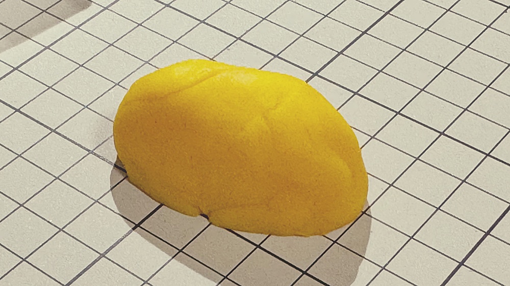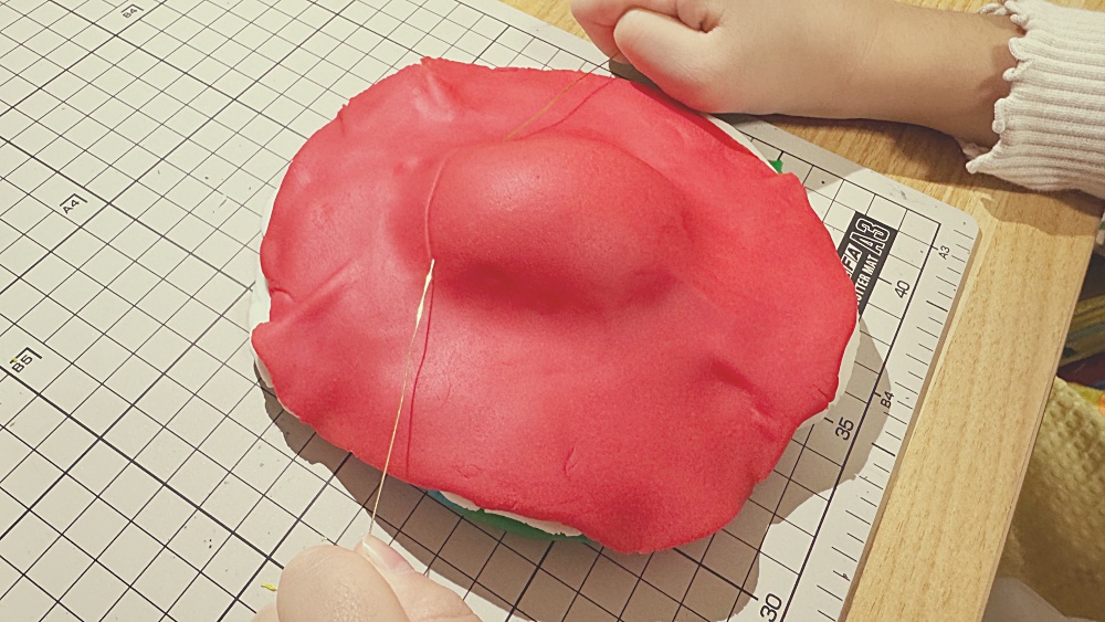 それを黄色の粘土であらわすために、少し丸めて、半分にワイヤーでスライスします。