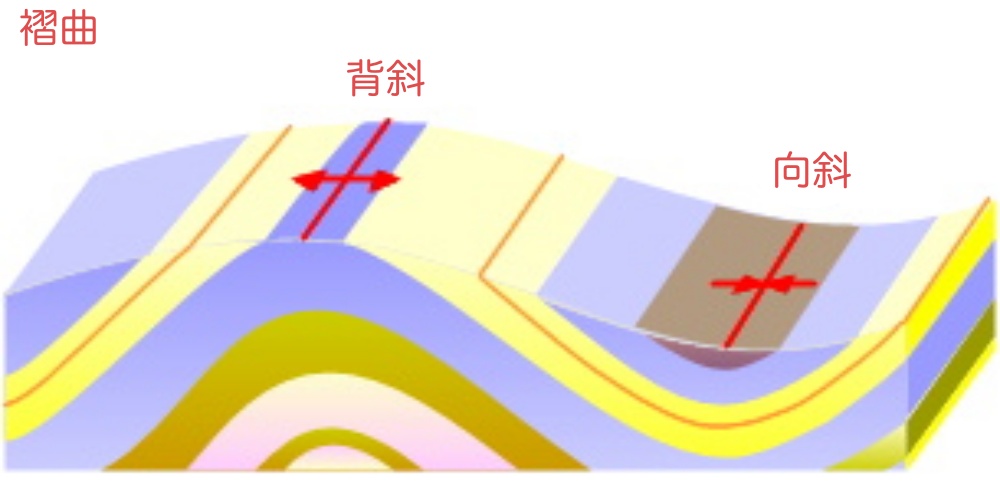 地層がプレートの動きで押されると、でこぼこに曲がります。